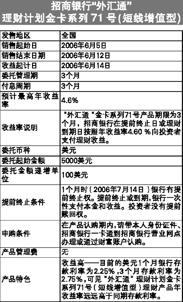 收益率说明“外汇通“金卡系列71号产品期限为3个月,招商银行在提前终止日或理财到期日按照年收益率4.60%向投资者支付理财收益。
