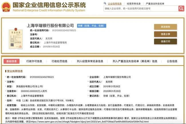 据国家企业信用信息公示系统信息,近日,上海华瑞银行股份有限公司(简称“华瑞银行”)有多项工商信息变更。