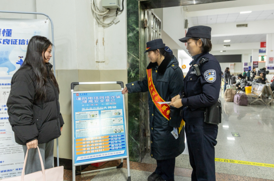 在售票处、候车大厅、出站口等客流密集区域,由民警和宣传员组成的流动宣传小分队灵活穿梭。针对不同场景精准发声:“陌生电话不轻信,陌生链接不点击”“车次改签请走官方渠道,切勿轻信短信链接”“公共Wi-Fi慎连接,个人信息护周全”“可疑理财不盲目,陌生软件不安装”,一句句接地气的提醒,将反诈防护网织密在旅客出行的每一个环节。