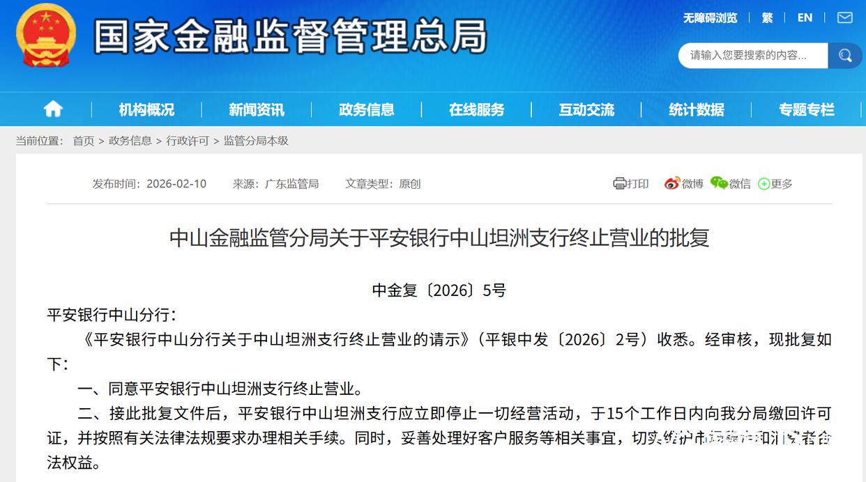 2026年2月10日,国家金融监督管理总局中山监管分局发布批复,同意平安银行中山坦洲支行终止营业,该支行自成立至今仅有五年多时间。据悉,2026年平安银行已有多家支行获准终止营业,涉及佛山、武汉等地。