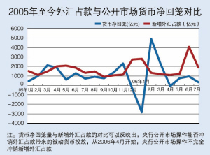 紧缩“第三招”是6月16日、7月21日两次上调存款准备金率0.5%,分别于7月5日、8月15日实施,共锁定资金3000-3200亿元。但5、6、7这三个月的外汇占款分别增长1211亿、4058亿、1900亿(7月尚未正式公布),共7169亿元。外汇占款增长很快,尤其是6月份。两次上调准备金率不过回笼了三个月不到一半的外汇占款。