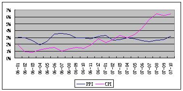 2、价格总水平。据国家统计局统计,10月居民消费价格指数(CPI)同比上涨6.5%,环比上涨0.3%。指数的同比增速再次回到8月份的高位,可见9月份指数同比增速的小幅回档并不意味着我们可以就此掉以轻心。食品类价格仍是拉动指数的主要原因,10月食品价格同比上涨17.6%,增速又高于9月0.7个百分点。本月初,成品油的提价也直接推升了指数的增长,且容易引发交通运输等行业的连锁反应。1-10月CPI累计同比上涨4.4%。本月,国家统计局局长谢伏瞻和央行三季度货币政策执行报告均预测全年CPI同比增长在4.5%左右,将远高于年初设定的3%目标。由于CPI上涨的深层次原因--货币供应量的增速不减,所以不排除后期月度CPI增速有再创新高的可能。受CPI上涨的影响,工业品出厂价格指数(PPI)的增长态势也逐步加速。10月PPI同比上涨3.2%,增速高于9月0.5个百分点。1-10月PPI累计同比上涨2.8%。