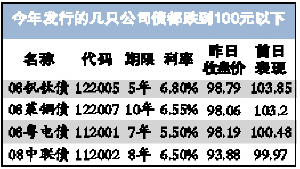 昨日也是43亿保利公司债发行日,该公司债票面利率为7%。不过,由于需要缴纳高达20%的个人所得税,算下来7%的票面利率到手只有5.6%。而若在二级市场进行买卖的话,收益就来自买卖差价。不过,记者统计发现,今年发行的几只公司债,都是按票面价值100元平价发行,但昨日收盘时都在100元以下(见上表)。