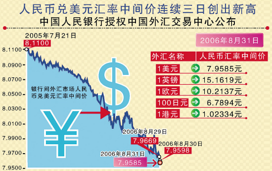 交易市场上,美元兑人民币汇率也是难掩涨势,并向下一个关口———7.95元靠近。撮合交易市场上美元兑人民币汇率收于7.9522元,较前日下挫63个基点;询价交易市场上美元兑人民币汇率跌落60个基点,收于7.9527元。