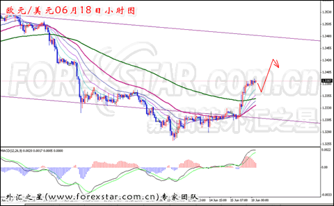 从小时图形上分析,均线系统拐头向上运行中,上周五短线反弹走势汇价已经完全突破均线的阻力作用,短线走势表现良好向上运行节奏。4小时图形上MACD指标向上即将测试零轴位置,上涨动能表现良好,预计今日欧元/美元短线走势保持震荡向上的可能性较大。