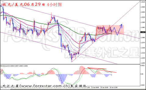从4小时图形上分析,短线走势处于横盘震荡整理运行节奏中,且汇价受到均线系统的良好依托作用。MACD指标继续形成顶背离现象,而短线主趋势节奏仍以向上为主。小时图MACD指标处于空头区域内,短线汇价区间上下沿当前支撑和阻力作用均较强,欧元/美元短线走势将继续维持横盘整理,待突破区间后在考虑介入操作。
