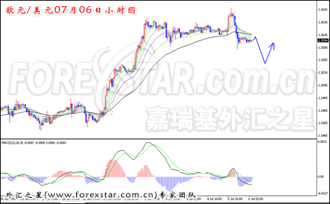 从小时图形上分析,昨日短线汇价受阻下落其力度较强,均线系统呈空头排列运行,MACD指标也向下穿越零轴位置,短线汇价受到均线的压制作用窄幅震荡整理。4小时图形上,5日均线出现拐头迹象,整理仍上行为主趋势节奏,预计今日欧元/美元短线继续下落调整后获得支撑重新上涨的概率较大。
