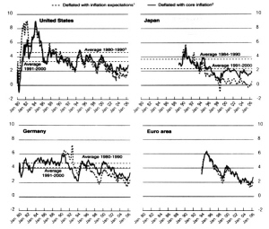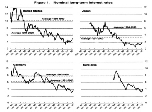 1980年以后,由于全球通货膨胀水平的持续下降,包括美国、日本和欧盟地区在内的主要发达国家都采取了相对宽松的货币政策,导致名义利率和实际利率均呈现持续下降的趋势,长期利率和短期利率水平也几乎趋同,发达国家内部不同风险债券的风险溢价也在不断收窄,同时发达国家和新兴经济体之间政府债券的风险溢价也在不断收窄,从而出现了一个由多种利率水平共同下降推动流动性整体过剩的局面。