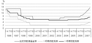 1996年到2002年期间中国人民银行采取了相对宽松的货币政策,和这一时期美国及世界主要经济体央行采取的货币政策基本一致。1996年初,中国人民银行公布的一年期贷款利率曾高达12.06%,1999年下调到5.85%,2002年又进一步下降到5.31%。2003年以来,中国经济持续强劲增长,GDP年均增长率连续5年保持在10%以上,投资和出口增长速度保持在30%以上,货币和信贷投放增长较快,M1、M2和人民币信贷增长保持在16%-18%以上。从2004年开始,中国人民银行开始采取货币紧缩政策,先后13次提高存款准备金率,使之达到目前13.5%的历史最高水平,连续8次提高贷款利率,目前1年期的贷款利率已经达到了7.29%。为了防止经济增长由偏快转为过热、防止价格由结构性上涨演变为明显通货膨胀,我们认为中国目前的货币政策仍然以紧缩为主,利率水平还有上升空间(见图5)。