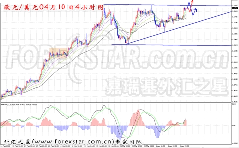 从小时图形上分析,均线系统呈多头运行为主,短线走势有效突破1.5800前期短线阻力位置。MACD指标上行穿越零轴位置,当前多头动能占优势。从4小时图形看,走势形态为较大级别的上升三角形雏形形态,当前走势在走D点,由于短线上行动能较强,存在从D点直接突破上行的可能行,今日欧元/美元短线主趋势仍以上看为主,关注前期历史高点的阻力作用,待有效突破后在决定进场做多欧元操作。