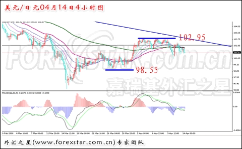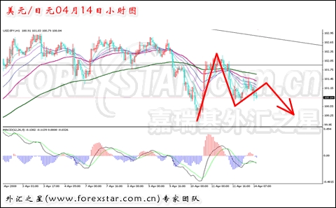 有仓者:手中若有美日多单,止损放在99.90,目标102.20;手中若有美日空单,止损放在101.60,目标99.00。