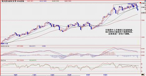 从欧元/美元走势看,前期说的日线图中的上升楔形下方支撑已经被跌破,从技术走势看,跌破1。9820之后,短期的进一步下调已经不可避免。这甚至有可能最终演化成欧元/美元走势的反转。目前周线MACD和RSI指标均线有从高位回落的趋势。如果没有大的意外,下周汇价将进一步下试低位,首先目标在1。5500,如该位失守,汇价下跌目标将延伸至1。9350。下周短期阻力在1。5320,关键阻力在1。5720。