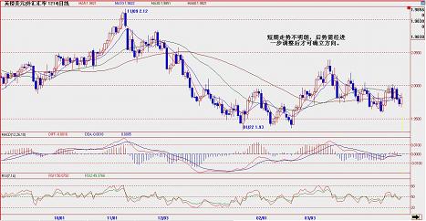 从英镑/美元走势看,从整体来看仍处于弱势之中,后市应该还有进一步下跌的风险,上方关键阻力仍是2。0000,只要不能回稳于其上,后市仍以继续下跌为主。但短期走势则没有明确方向,汇价处于暂时的平衡状态。下周初汇价可能继续盘整格局,之后仍倾向于会继续向下,目前下方短期支撑还是1。9670和1。9600,跌破后者则汇价将进一步大幅下跌。投资者在操作上还是继续以逢高卖出为操作原则。