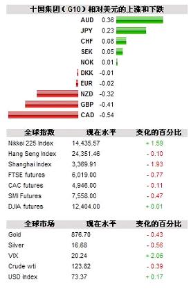 我们仍然能看到风险有所下降。稀有金属和能源商品有序地退出市场,而波动率指数持续上扬。今天上午亚洲市场的交易情况比较复杂。美元的强势有利于日本和韩国的进口商,但是中国企业大量募集资金的计划可能对中国和香港的股市产生负面影响。美元对其它主要货币的汇率基本保持不变,随后油价下跌至三周以来的最低点。7月远期合同下跌$3.45至$124.31。黄金交易市场低收,成为三大板块中最弱的。最活跃的8月远期合同下跌$11.50到$885.50,而7月金属银的远期下挫7.5%到$16.835/oz。