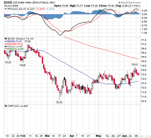 笔者自年初便指出08年是美元反弹年,自五月更多番指出,美元早已在百般不利消息中辗转酝酿绝地反弹,反攻已渐渐成形,主要原因是欧盟区经济放慢忧虑加深和预期美国息口将见底,现在市场已从预期渐渐变成共识,除此之外,布什总统,财长保尔森,伯南克,甚至格老等均在近日异口同声,口径一致,「制造」更强的加息「预期」,当然也令美元更上一层楼。即使各大专家唱淡的美股,也能在大升大跌之后,一次又一次令淡友失望,力守三月底部重要支持,种种信号皆指向美元将有出人意表的动向,一味盲目看淡的朋友须小心了!