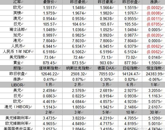 外汇市场上,美元上涨,兑日圆升至三个月高位。欧元兑美元报1。5506美元,当日下跌0。8%;美元兑日圆报105。55日圆,上涨0。9%;美元指数当日上升0。7%至73。023。