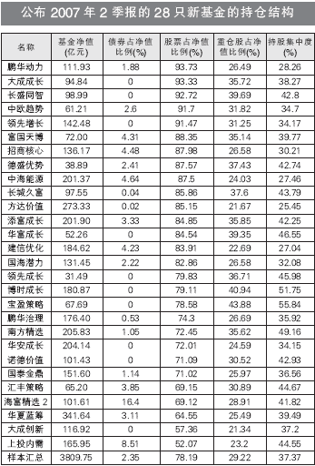 新基金股票仓位与偏股型基金整体基本一致,股票投资更为分散。除了2只债券型基金外,剩余34只偏股型新基金有28只公布了2007年2季报。28只偏股型新基金2007年2季度末的整体仓位为78.19%,与积极投资偏股型基金78.36%的股票仓位基本相当。但是股票投资更趋于分散,整体持股集中度为37.37%,低于积极投资偏股型基金整体7.87个百分点。