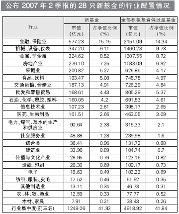 2007年2季度28只公布季报新基金重仓金融保险、机械设备、金属非金属、房地产等行业,重仓行业和配置比例与积极投资偏股型基金基本一致。其中对于金融保险行业和房地产行业的投资占净值的比例分别为15.15%和7.25%,略高于偏股型基金整体0.81和0.33个百分点;对于机械设备和金属行业的配置比例分别为9.11%和8.52%,略低于偏股型基金整体0.62和0.20个百分点;对于采掘、食品饮料、交通运输三个行业的配置比例也略高于偏股型基金整体水平。总体上来看,前三大行业集中度为41.93%,略高于偏股型基金整体0.09个百分点。