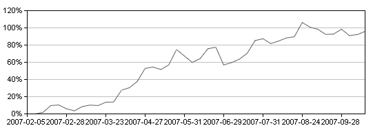 如今,上海证大联手平安信托发行了三期集合资金信托计划。收益率水平在信托型私募基金中名列前茅。截至2007年10月15日,平安证大一期集合资金信托计划单位累计净值增长率为92.18%(图1),这里面已经扣除了20%的业绩提成。因此,在一些公开场合,朱南松才敢于高调的表示上海证大并没有跑输公募基金。