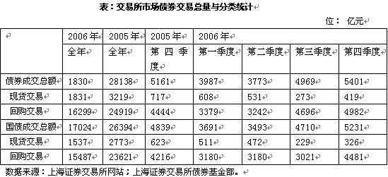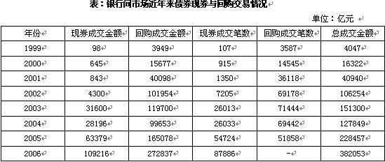 我国债券交易市场包括银行间市场和交易所市场。这两个市场的交易规模都有了长足的发展。以银行间市场为例。2006年全年的交易规模为382053亿元,而2001年才40940亿元。4年的时间,交易量增长了近8倍。