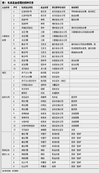 即:海归派,由海归派管理的私募基金,以赵丹阳的赤子之心为代表;券商派,由证券公司投资人士、知名股评家等成立的私募基金,以赵军管理的淡水泉投资管理公司为代表;民间派,由民间人士、民间股票投资高手、民间股神管理,以林园系列私募基金为代表;公募基金经理派,由管理业绩优秀的公募基金经理转型设立的私募基金,以肖华(原任博时价值增长基金经理)管理的尚诚信托、梁文涛(原任易方达平稳增长,基金科汇基金经理)管理的亿龙中国信托、王贵文管理的隆圣信托等为代表(见表1)。