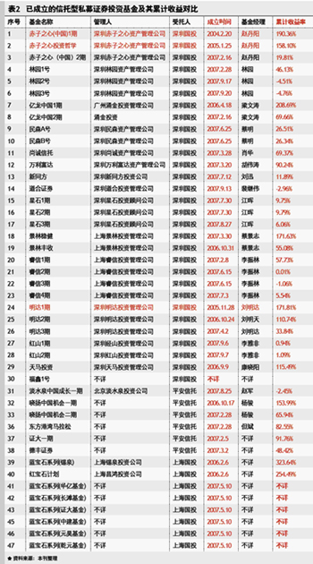 不过,在所有私募基金中,赤子之心相对历史更长,尽管对本轮行情看错,其2004年2月发行的赤子之心(中国)1期和和2005年1月发行的赤子之心投资哲学两只私募基金,其累计收益率均超过150%(见表2)。