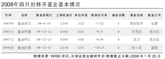 2008年尚有四只基金将进入封转开程序,主要集中在12月份,上半年只有一只基金鸿飞。对于长线投资者我们推荐优秀基金管理公司管理的优质基金:基金科翔、基金科汇。对于这两只基金,我们认为在2008年投资投机两相宜。