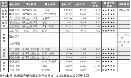 说明:通过对基金历史表现进行分析,并结合对未来市场走势的研判,我们推荐出不同风险程度的基金投资组合。我们考察的重点是推荐的基金投资组合与市场基金收益的关系,目的是看该组和是否能够战胜市场。基于我们对大盘将持续大幅振荡以及对债券市场走软的预期,我们降低了对投资组合中股票型基金和债券型基金的权重。
