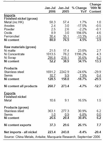 昨天我们提到,镍和铜面临着全球短缺的问题,这从中国镍的净贸易数据可以明显看出,今前的前七个月中国净进口含镍量下降了2万吨,这是中国2006年中国在全球镍市场需求的表现。虽然镍价格的季节性反弹可以在中国之外找到原因,但是中国在过去五年的经济增长是镍市场在近几年变得紧张的主要原因。