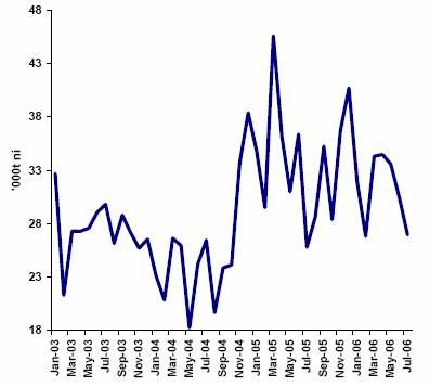 中国本地不锈钢产量年比25%的增长刺激了镍制成品和原材料的进口增长。中国镍矿产量同比增长了14.7%(含镍5200吨),达到40500吨。但是我们估计在上半年镍清库为中国需求提供了1-1.5万吨镍,不锈钢的清库提供了2万吨。 图2,中国所有镍产品的月度净进口——较05年上半年有所减缓