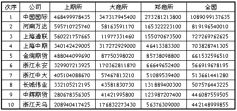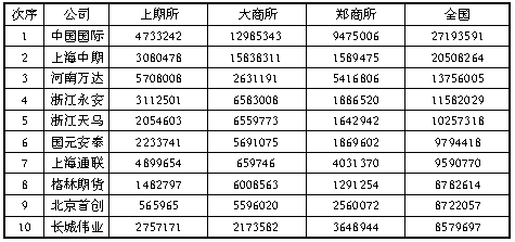 分交易所来看,河南万达、上海通联、金瑞期货、中国国际、浙江中大位居上海期交所代理额的前5位;中国国际、河南万达、上海通联、长城伟业、中辉期货位居郑商所代理额的前5位;中国国际、上海中期、中谷期货、浙江天马、浙江永安位居大商所代理额的前5位。