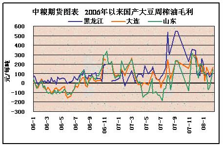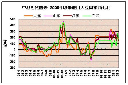 春节过后,农产品市场迎来一波涨价狂潮,国际市场炒作中国节后需求旺盛的气氛浓重,这可能会导致豆粕和豆油价格短期继续上扬,并导致压榨利润可能继续上扬。(上述压榨利润为纯粹理论推算,没有考虑压榨企业运用套保技术以及其他的促销手段增加销量所得。当然,油厂的实际进口成本以及加工成本有差异,我们采集的数据只是以当日的市场价格为准,并且没有考虑因为技术进步而导致的加工费用的降低。)