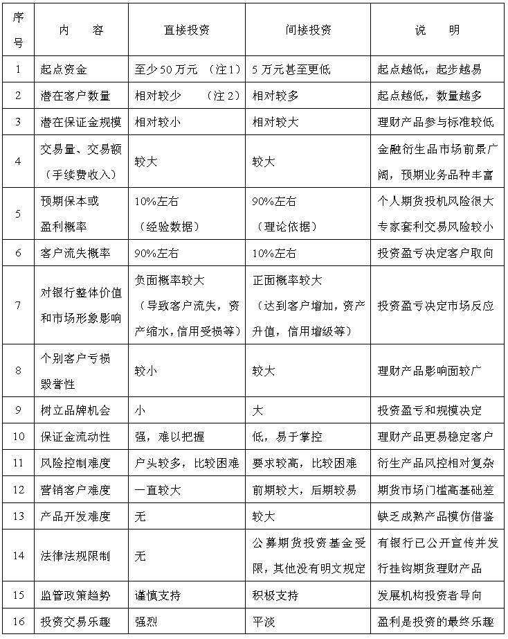 从以上对比分析,我们可以很清晰地看到,相对而言,引导客户认购挂钩期货的套利理财产品,间接投资股指期货的市场风险较小,盈利机会较大,业务前景较为广阔,利于树立商业银行期货业务品牌形象,但前期操作难度较高,期货理财产品开发实属不易。而营销客户直接从事股指期货投资正好相反,市场风险较大,盈利机会渺茫,业务前景不容乐观,只是前期操作较为简单,比较容易上手,便于商业银行迅速进入期货市场开展期货业务。