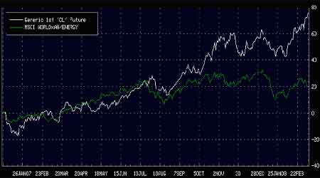 图1:能源股和国际油价比较图(2007年1月26日到2008年3月10日止)