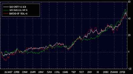 在此2007年1月26日到2008年3月10日期间,三只基金的回报介乎42.4%至45.8%,十分接近,中途则有较明显的差异,主要由于农产品于2007年稍为落后,至2008年才发力赶上。