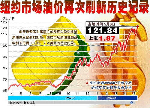 美国原油库存增加及美元走强并未抑制油价一路走高的趋势,国际油价7日再创新高,纽约市场原油价格盘中创下每桶123.80美元的历史记录。