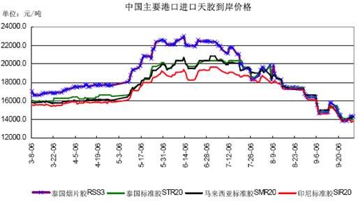 由于各橡胶主产国产量的增加,预计2007年供应量相对充足。国内天然橡胶产区价格走势见下图。