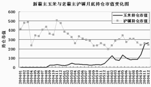 附图是沪铜和玉米期货月末持仓市值变化对照图,从中可看出,玉米期货月末持仓市值已经达到265.15亿元,超越沪铜242.37亿元,考虑到月末持仓市值排第三的沪铝只有159.49亿元,可以说,国内期货市场已经进入玉米和沪铜新老霸主双雄竞争阶段。