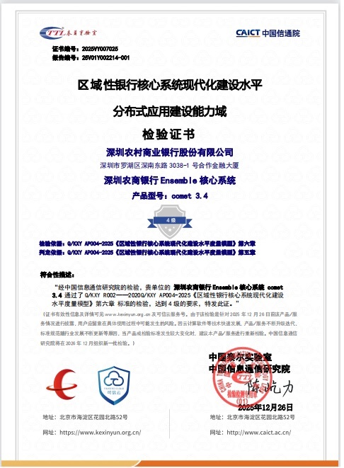 近日,深圳农商银行在核心系统现代化建设与科技创新领域捷报频传,接连荣获两项权威奖项——“区域性银行核心系统现代化建设水平评估”分布式应用建设能力域先进级(4级),以及“2025年度农村金融机构科技创新优秀案例评选”信创应用创新优秀案例。这两项荣誉,不仅是对深圳农商银行于2025年4月全面投产的第三代核心系统(以下简称“三代系统”)成果的行业认证,更是对该行坚定不移走科技自立自强、自主可控数字化转型道路的有力印证。