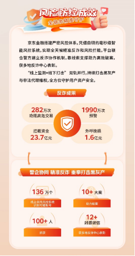 依托自研的毫秒级智能风控系统,京东金融实现全天候精准反诈和风险拦截,平台联合警方建立反诈协作机制,通过“线上监测+线下打击”双轨并行,持续打击黑灰产与非法代理维权,靠线索支撑助力多地警方高效破案,获多地反诈中心表彰。截至2025年末,平台累计预警1990万次、劝阻高危交易282万次,拦截资金23.7亿元、外呼挽损1.6亿元,切实守护用户资产安全。