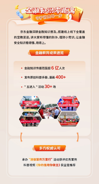 2025年,京东金融承办的“清保慧传万里行”系列活动获评金融消费者教育优秀案例;线上依托直播、短视频、图文专栏等形式,推出“金融安全小课堂”“反诈防骗指南”等系列内容,金融知识传播范围超6亿人;线下联合社区、高校开展“金融知识进万家”活动,全年举办活动超30场活动。