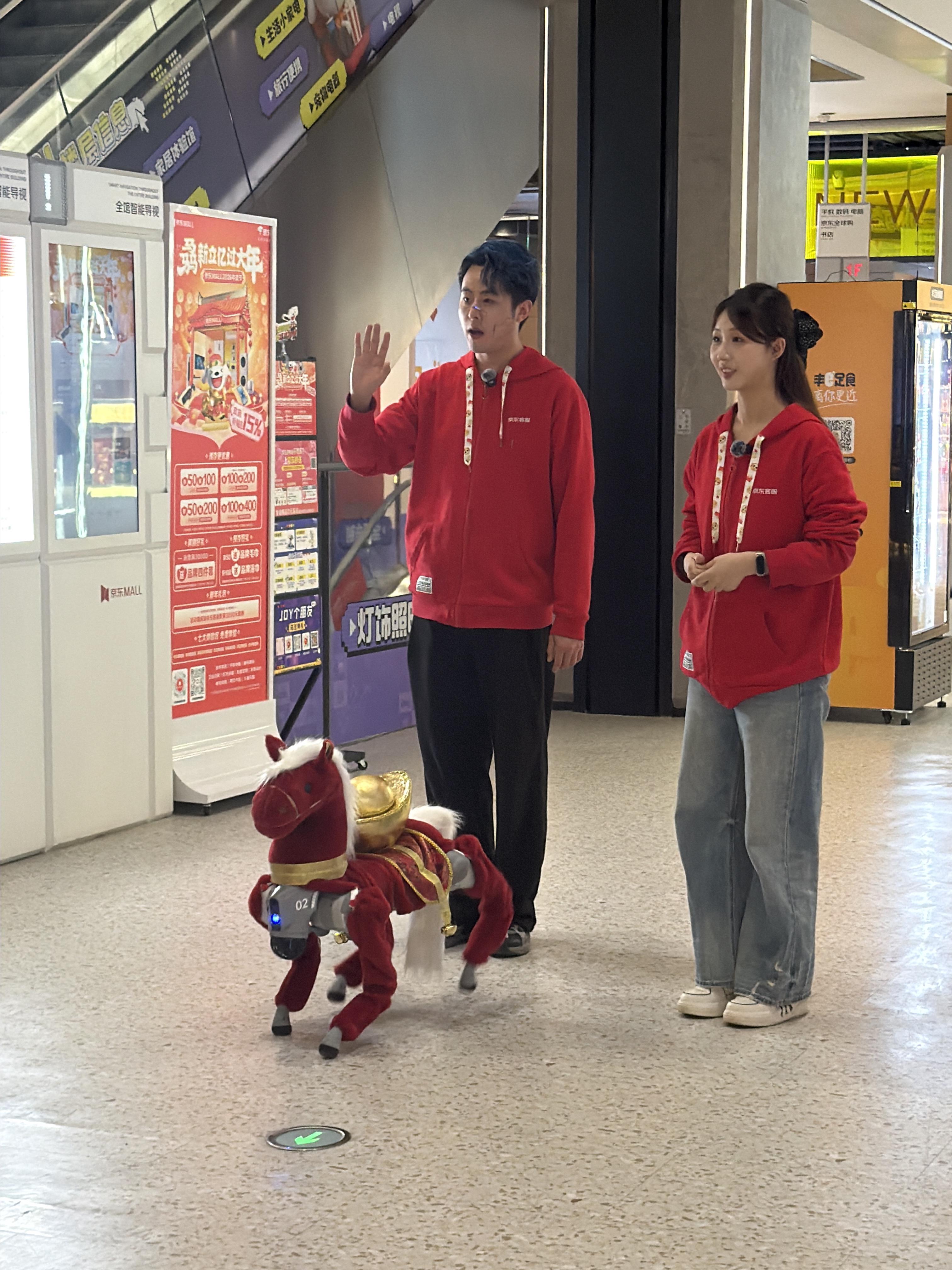 到了下午6点,随着一段极具科幻感的“唤醒仪式”,客服主播“小马哥”正式带大家走进京东MALL,开启关于AI生活的实地探访。在京东MALL一楼3C数码区,客服主播“小马哥”围绕AI应用场景,实地体验并演示了多款数码产品的核心功能,通过直播镜头,将产品操作直观呈现在了消费者面前。随后,在生活方式区域,直播介绍了小家电、儿童与宠物类等AI科技产品,并邀请现场顾客参与体验。在家电大件区域,直播聚焦了智能家电的AI功能与相应的国补优惠,客服主播同步讲解补贴政策与购买要点,帮助线上观众快速理解怎么买更划算。除此之外,现场智能机器人还向观众展示了武术,跳舞等技能,还有机器狗扮成小马驹,喜迎马年新春的到来。