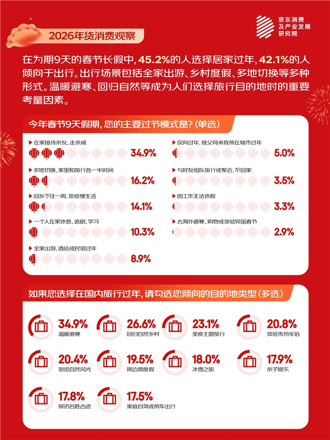 2026年9天的超长春节假期,为人们提供了前所未有的时间自由度,催生了更为多元的过节模式。调研显示,45.2%的人选择在家过年,其中“接待亲友或走访亲戚”、“在家休息”等成为主要选项,同时有42.1%的人选择与出行相关的选项,包括全家出游、乡村度假、多地切换等。