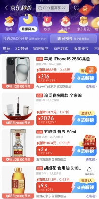 根据京东“月黑风高”超级盛典活动页面显示,2月16日晚8点,iPhone15手机将以216元的惊喜价格上架,优惠力度绝无仅有,此外还有iPhone 17 Pro以旧换新至高补贴1400元;当晚9点“逢9抢酒”,限量马年茅台准时发售,更有剑南春、五粮液、郎酒等大牌明酒限时抢购!