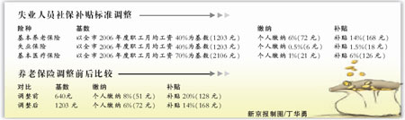 补贴基数上调最少近一倍昨日,市劳动和社会保障局社保中心副主任袁建设介绍,基本养老保险以全市2006年度职工月平均工资40%为基数,个人缴纳6%,补贴14%;失业保险以全市2006年度职工月平均工资40%为基数,个人缴纳0.5%,补贴1.5%;基本医疗保险以全市2006年度职工月平均工资70%为基数,个人缴纳1%,补贴6%.袁建设介绍,按照此前统计部门发布的数据,2006年北京市职工月平均工资为3008元。按照各险种的政策规定,凡以2006年职工月平均工资的70%、40%为基数缴费的,其缴费工资基数将分别为2106元、1203元。