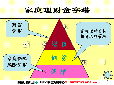 简而言之,家庭理财的金字塔中,保障作为塔基,是家庭风险管理的屏障;储蓄为一些未来不确定的人生做好充足准备,像医疗、意外、重疾的风险,如积累教育金、养老金,适宜用风险较低的工具解决;当保障层及储蓄层所需资金全都已满足,还能余资金,这时就可以大胆投资,追求更高的投资报酬率,像股票期货等。 而在这里资产配置最为关键,利用家庭资产配置,就可以将理财效应发挥,并保证了财务的安全,实现可持续的财富增长。