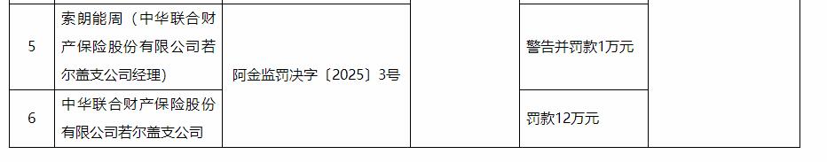 国家金融监督管理总局阿坝监管分局对中华联合财产保险股份有限公司若尔盖支公司罚款12万元,对索朗能周(中华联合财产保险股份有限公司若尔盖支公司经理)警告并罚款1万元。