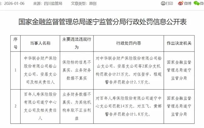 具体来看,1月6日,国家金融监督管理总局遂宁监管分局对中华联合财产保险股份有限公司船山支公司、安居支公司及相关责任人作出处罚。主要违法违规行为涉及保险标的信息不真实、业务财务数据不真实。监管机构对上述两家分支机构合计罚款25万元,对相关责任人伍登宇、程超给予警告并合计罚款2.5万元。