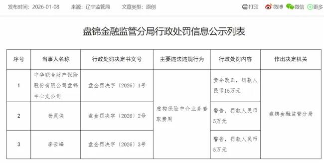 1月8日,盘锦金融监管分局公布对中华联合财产保险股份有限公司盘锦中心支公司及相关责任人的处罚决定。该公司因虚构保险中介业务套取费用被责令改正并罚款15万元。相关责任人杨灵侠、李云峰分别被警告并处罚款5万元。