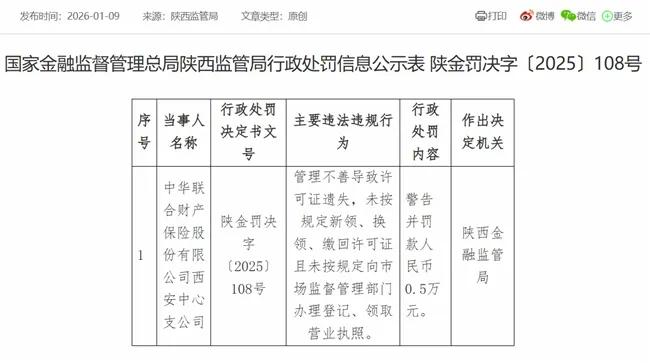 同日,陕西监管局对中华联合财产保险股份有限公司西安中心支公司作出行政处罚。该公司因管理不善导致许可证遗失,未按规定办理相关登记及领取营业执照,被处以警告并罚款0.5万元。